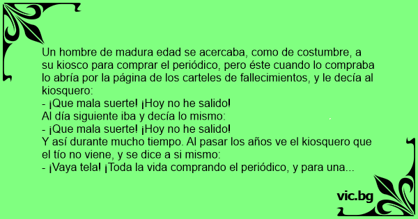 Un hombre de madura edad se acercaba, como de costumbre, a su kiosco para comprar el periódico, pero éste cuando lo compraba lo abría por la página de los carteles de fallecimientos, y le decía al kiosquero: