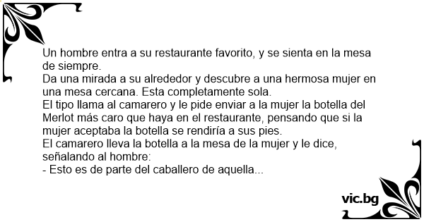El tipo llama al camarero y le pide enviar a la mujer la botella del Merlot más caro que haya en el restaurante, pensando que si la mujer aceptaba la botella se rendiría a sus pies.
