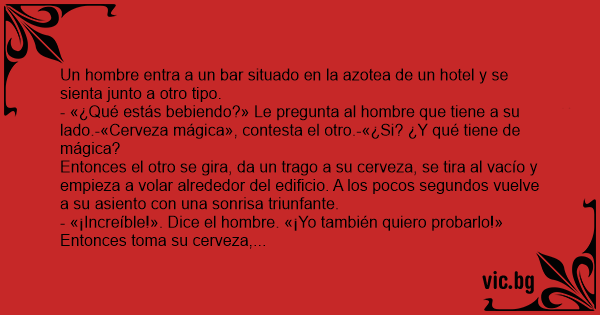 - «¿Qué estás bebiendo?» Le pregunta al hombre que tiene a su lado.-«Cerveza mágica», contesta el otro.-«¿Si? ¿Y qué tiene de mágica?