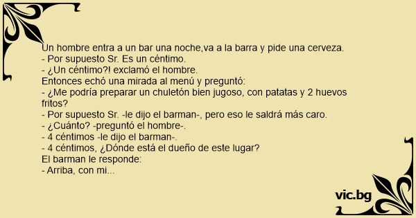Un hombre entra a un bar una noche,va a la barra y pide una cerveza.
