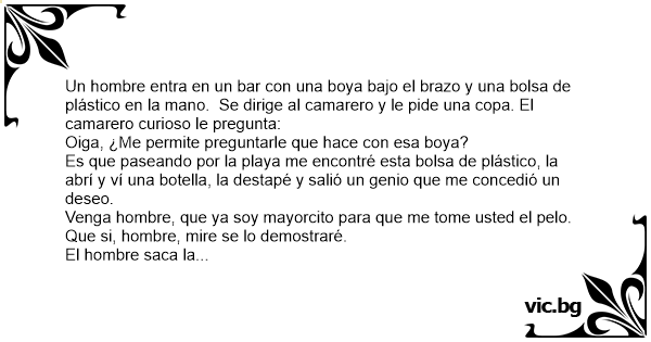 Un hombre entra en un bar соn una boya bajo el brazo y una bolsa de plástico en la mano. Se dirige al camarero y le pide una copa. El camarero curioso le pregunta: