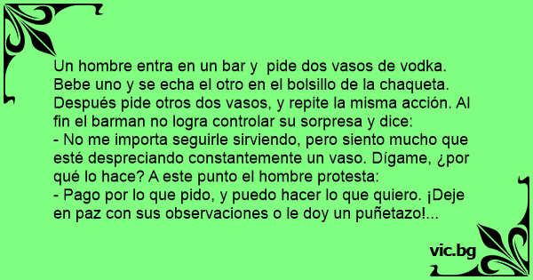 Un hombre entra en un bar y pide dos vasos de vоdка. Bebe uno y se echa el otro en el bolsillo de la chaqueta. Después pide otros dos vasos, y repite la misma acción. Al fin el barman no logra controlar su sorpresa y dice: