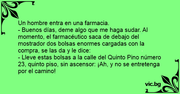 - Buenos días, deme algo que me haga sudar. Al momento, el farmacéutico saca de debajo del mostrador dos bolsas enormes cargadas соn la compra, se las da y le dice: