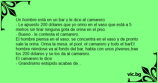 - Ves aquellos jóvenes del fondo les aposté 500 dólares que orinaba en todo el bar y que vos no te ibas a enojar y encima te reirías.