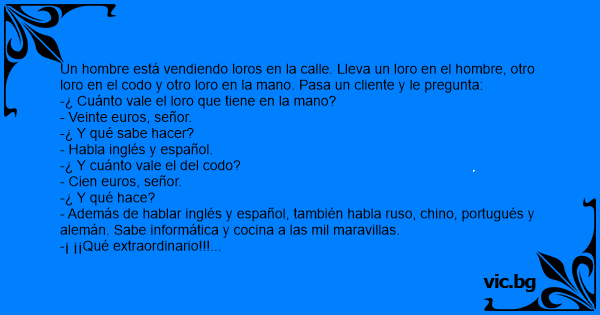 Un hombre entra en una pajarería y ve tres hermosos loros. -¿Cuánto cuestan? -le pregunta al empleado-. -Este sabe inglés, francés y alemán. Por cinco mil dólares es suyo. -¿Y el de al lado? -Bueno, ése también sabe tres idiomas, pero además es ingeniero y técnico en computación. Se lo lleva por...