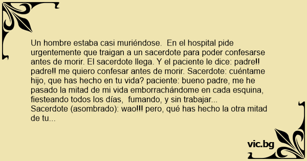 Un hombre estaba casi muriéndose. En el hospital pide urgentemente que traigan a un sacerdote para poder confesarse antes de morir. El sacerdote llega. Y el paciente le dice: padre!!padre!! me quiero confesar antes de morir. Sacerdote: cuéntame hijo, que has hecho en tu vida? paciente: bueno padre, me he pasado la mitad de mi vida emborrachándome en cada esquina, fiesteando todos los días, fumando, y sin trabajar...