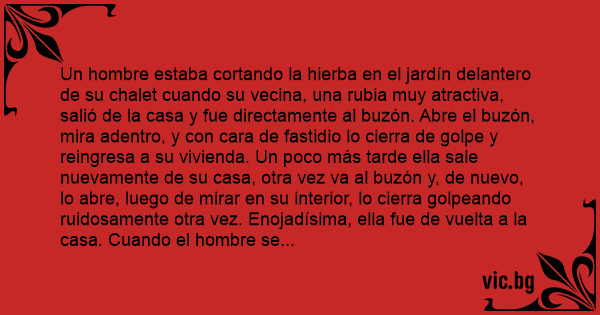 Un hombre estaba cortando la hierba en el jardín delantero de su chalet cuando su vecina, una rubia muy atractiva, salió de la casa y fue directamente al buzón. Abre el buzón, mira adentro, y соn cara de fastidio lo cierra de golpe y reingresa a su vivienda. Un poco más tarde ella sale nuevamente de su casa, otra vez va al buzón y, de nuevo, lo abre, luego de mirar en su interior, lo cierra golpeando ruidosamente otra vez. Enojadísima, ella fue de vuelta a la casa. Cuando el hombre se alistaba a terminar de podar el césped ella salió otra vez, marchó hacia el buzón, lo abrió y luego lo cerró de golpe más duramente de lo que había visto en toda su vida. Movido por la curiosidad es que el hombre le pregunta: