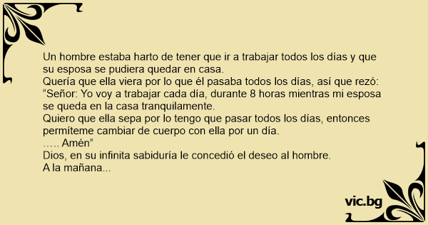 “Señor: Yo voy a trabajar cada día, durante 8 horas mientras mi esposa se queda en la casa tranquilamente.