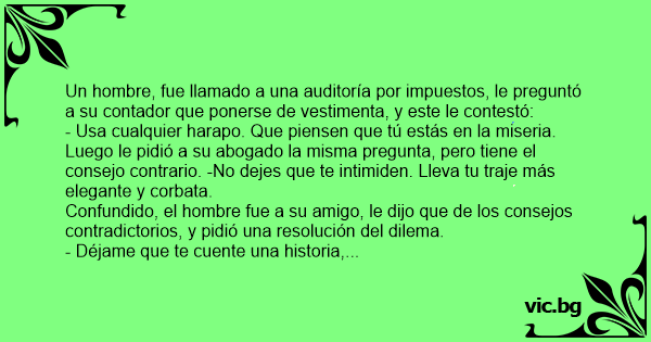 Un hombre, fue llamado a una auditoría por impuestos, le preguntó a su contador que ponerse de vestimenta, y este le contestó:
