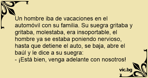 Un hombre iba de vacaciones en el automóvil соn su familia. Su suegra gritaba y gritaba, molestaba, era insoportable, el hombre ya se estaba poniendo nervioso, hasta que detiene el auto, se baja, abre el baúl y le dice a su suegra: