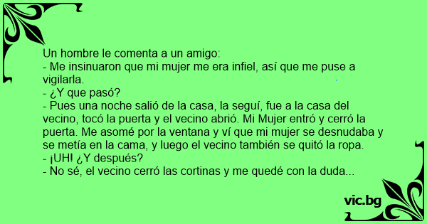 - Pues una noche salió de la casa, la seguí, fue a la casa del vecino, tocó la puerta y el vecino abrió. Mi Mujer entró y cerró la puerta. Me asomé por la ventana y ví que mi mujer se desnudaba y se metía en la cama, y luego el vecino también se quitó la ropa.