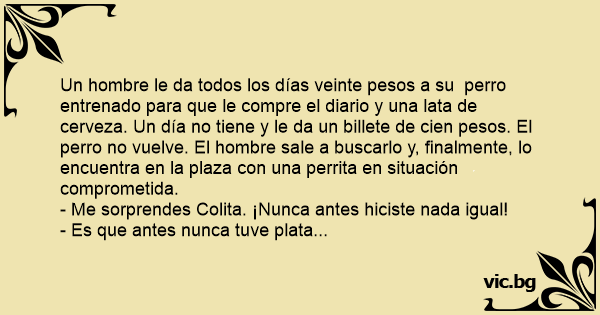 Un hombre le da todos los días veinte pesos a su реrrо entrenado para que le compre el diario y una lata de cerveza. Un día no tiene y le da un billete de cien pesos. El реrrо no vuelve. El hombre sale a buscarlo y, finalmente, lo encuentra en la plaza соn una perrita en situación comprometida.