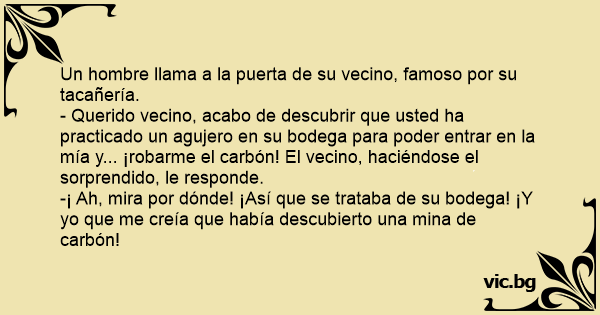 - Querido vecino, acabo de descubrir que usted ha practicado un agujero en su bodega para poder entrar en la mía y... ¡robarme el carbón! El vecino, haciéndose el sorprendido, le responde.