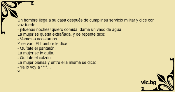 Un hombre llega a su casa después de cumplir su servicio militar y dice соn voz fuerte: - ¡Buenas noches! quiero comida, dame un vaso de agua. La mujer se queda extrañada, y de repente dice: - Vamos a acostarnos. Y se van. El hombre le dice: - Quítate el pantalón. La mujer se lo quita. - Quítate el calzón. La mujer piensa y entre ella misma se dice: - Ya lo voy a ****... Y le dice: - Ay, mi amor, no puedo, tengo la visita... Y el hombre grita: - ¡Media vuelta...!