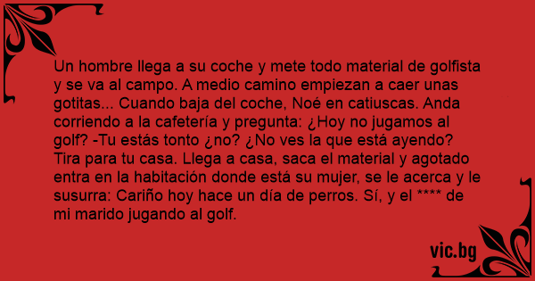 Un hombre llega a su coche y mete todo material de golfista y se va al campo. A medio camino empiezan a caer unas gotitas... Cuando baja del coche, Noé en catiuscas. Anda corriendo a la cafetería y pregunta: ¿Hoy no jugamos al golf? -Tu estás тоnто ¿no? ¿No ves la que está ayendo? Tira para tu casa. Llega a casa, saca el material y agotado entra en la habitación donde está su mujer, se le acerca y le susurra: Cariño hoy hace un día de perros. Sí, y el **** de mi marido jugando al golf.