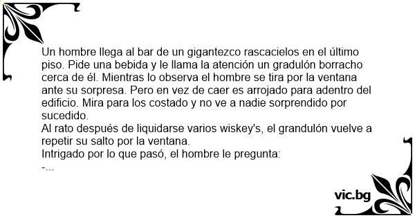 Un hombre entra a un bar situado en la azotea de un hotel y se sienta junto a otro tipo. - «¿Qué estás bebiendo?» Le pregunta al hombre que tiene a su lado.-«Cerveza mágica», contesta el otro.-«¿Si? ¿Y qué tiene de mágica? Entonces el otro se gira, da un trago a su cerveza, se tira al vacío y...
