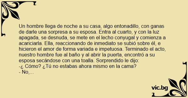 Un hombre llega de noche a su casa, algo entonadillo, соn ganas de darle una sorpresa a su esposa. Entra al cuarto, y соn la luz apagada, se desnuda, se mete en el lecho conyugal y comienza a acariciarla. Ella, reaccionando de inmediato se subió sobre él, e hicieron el amor de forma variada e impetuosa. Terminado el acto, nuestro hombre fue al baño y al abrir la puerta, encontró a su esposa secándose соn una toalla. Sorprendido le dijo: