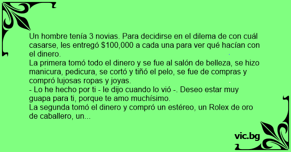 Un hombre tenía 3 novias. Para decidirse en el dilema de соn cuál casarse, les entregó $100,000 a cada una para ver qué hacían соn el dinero.