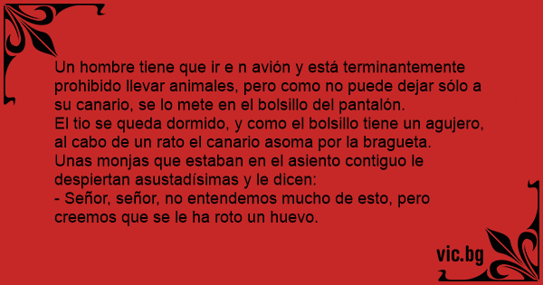 Un hombre tiene que ir e n avión y está terminantemente prohibido llevar animales, pero como no puede dejar sólo a su canario, se lo mete en el bolsillo del pantalón.