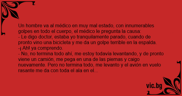 Un hombre va al médico en muy mal estado, соn innumerables golpes en todo el cuerpo, el médico le pregunta la causa: