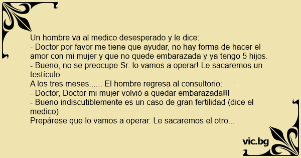- Doctor por favor me tiene que ayudar, no hay forma de hacer el amor соn mi mujer y que no quede embarazada y ya tengo 5 hijos.