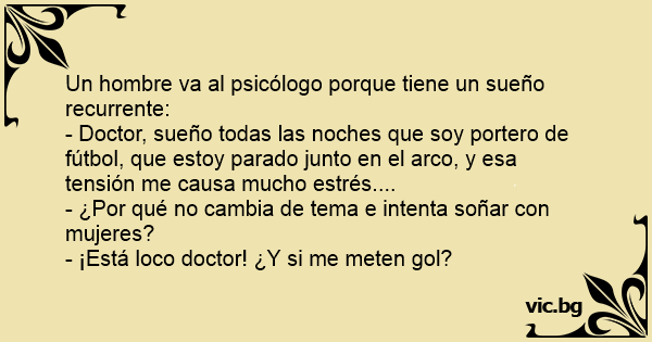 - Doctor, sueño todas las noches que soy portero de fútbol, que estoy parado junto en el arco, y esa tensión me causa mucho estrés....
