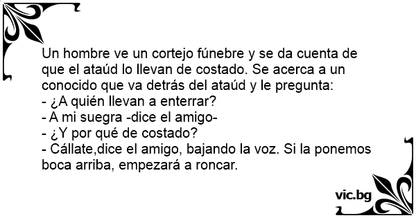 Un hombre ve un cortejo fúnebre y se da cuenta de que el ataúd lo llevan de costado. Se acerca a un conocido que va detrás del ataúd y le pregunta: