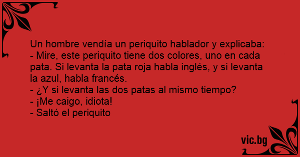 - Mire, este periquito tiene dos colores, uno en cada pata. Si levanta la pata roja habla inglés, y si levanta la azul, habla francés.