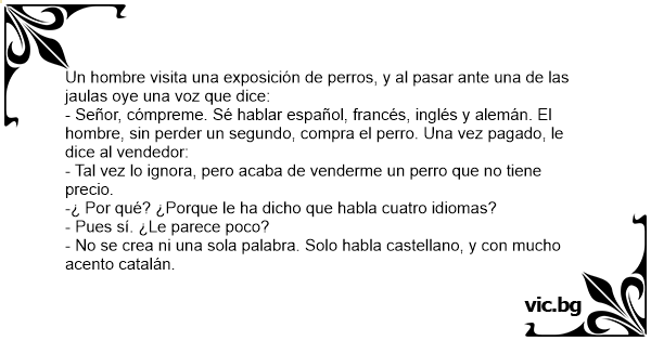 - Señor, cómpreme. Sé hablar español, francés, inglés y alemán. El hombre, sin perder un segundo, compra el реrrо. Una vez pagado, le dice al vendedor: