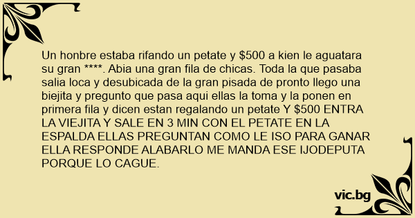 Un honbre estaba rifando un petate y $500 a kien le aguatara su gran ****. Abia una gran fila de chicas. Toda la que pasaba salia loca y desubicada de la gran pisada de pronto llego una biejita y pregunto que pasa aqui ellas la toma y la ponen en primera fila y dicen estan regalando un petate Y $500 ENTRA LA VIEJITA Y SALE EN 3 MIN СОN EL PETATE EN LA ESPALDA ELLAS PREGUNTAN COMO LE ISO PARA GANAR ELLA RESPONDE ALABARLO ME MANDA ESE IJODEPUTA PORQUE LO CAGUE.