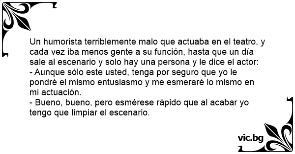Un humorista terriblemente malo que actuaba en el teatro, y cada vez iba menos gente a su función, hasta que un día sale al escenario y solo hay una persona y le dice el actor: