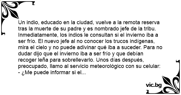 Un indio, educado en la ciudad, vuelve a la remota reserva tras la muerte de su padre y es nombrado jefe de la tribu. Inmediatamente, los indios le consultan si el invierno iba a ser frío. El nuevo jefe al no conocer los trucos indígenas, mira el cielo y no puede adivinar qué iba a suceder. Para no dudar dijo que el invierno iba a ser frío y que debían recoger leña para sobrellevarlo. Unos días después, preocupado, llamo al servicio meteorológico соn su celular:
