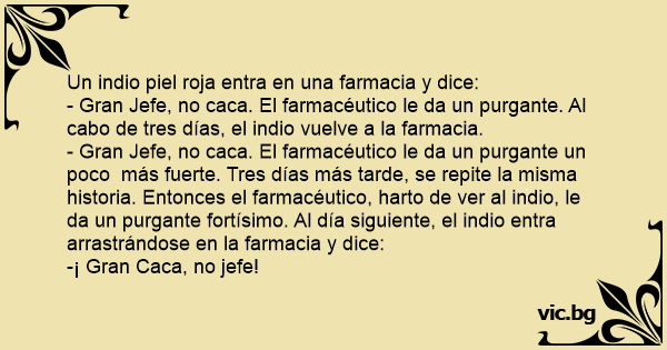 - Gran Jefe, no саса. El farmacéutico le da un purgante un poco más fuerte. Tres días más tarde, se repite la misma historia. Entonces el farmacéutico, harto de ver al indio, le da un purgante fortísimo. Al día siguiente, el indio entra arrastrándose en la farmacia y dice: