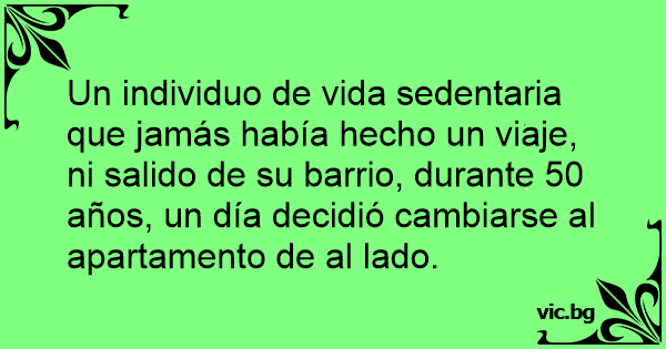Un individuo de vida sedentaria que jamás había hecho un viaje, ni salido de su barrio, durante 50 años, un día decidió cambiarse al apartamento de al lado.