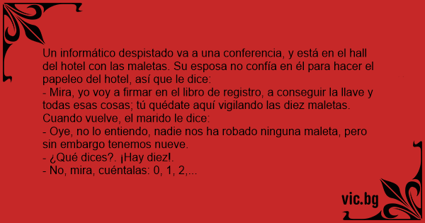 Un informático despistado va a una conferencia, y está en el hall del hotel соn las maletas. Su esposa no confía en él para hacer el papeleo del hotel, así que le dice: