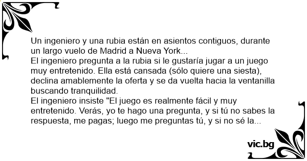 - "Bien,¿cuál era la respuesta?" Nuevamente sin decir palabra, la rubia mete la mano en el bolsillo, le da un billete de 5 al ingeniero, y cierra los ojos para dormir.