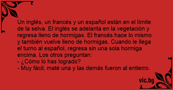 Un inglés, un francés y un español están en el límite de la selva. El inglés se adelanta en la vegetación y regresa lleno de hormigas. El francés hace lo mismo y también vuelve lleno de hormigas. Cuando le llega el turno al español, regresa sin una sola hormiga encima. Los otros preguntan: