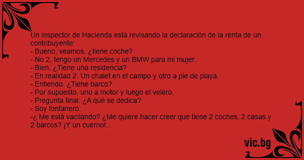 -¿ Me está vacilando? ¿Me quiere hacer creer que tiene 2 coches, 2 casas y 2 barcos? ¡Y un cuerno!