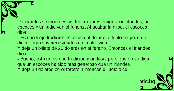 Un irlandes se muere y sus tres mejores amigos, un irlandes, un escoces y un judio van al funeral. Al acabar la misa, el escoces dice: