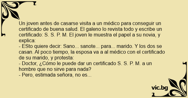 Un joven antes de casarse visita a un médico para conseguir un certificado de buena salud. El galeno lo revista todo y escribe un certificado: S. S. P. M. El joven le muestra el papel a su novia, y explica: