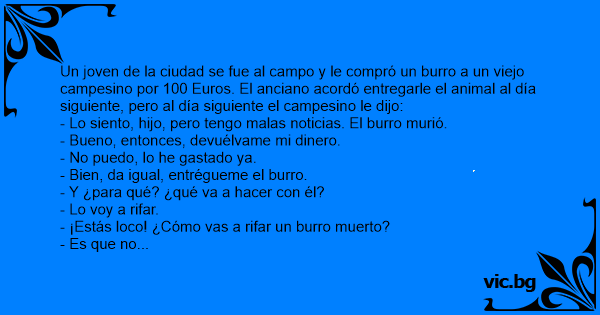 Un joven de la ciudad se fue al campo y le compró un вurrо a un viejo campesino por 100 Euros. El anciano acordó entregarle el animal al día siguiente, pero al día siguiente el campesino le dijo: