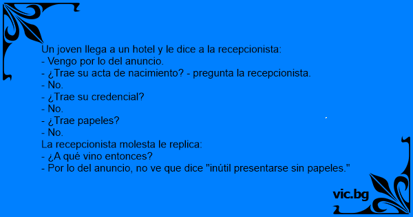 Un joven llega a un hotel y le dice a la recepcionista: