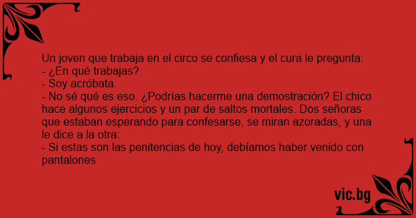 - No sé qué es eso. ¿Podrías hacerme una demostración? El chico hace algunos ejercicios y un par de saltos mortales. Dos señoras que estaban esperando para confesarse, se miran azoradas, y una le dice a la otra: