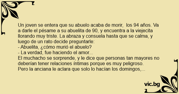 Un joven se entera que su abuelo acaba de morir, los 94 años. Va a darle el pésame a su abuelita de 90, y encuentra a la viejecita llorando muy triste. La abraza y consuela hasta que se calma, y luego de un rato decide preguntarle: