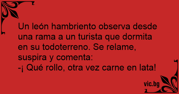 Un león hambriento observa desde una rama a un turista que dormita en su todoterreno. Se relame, suspira y comenta: