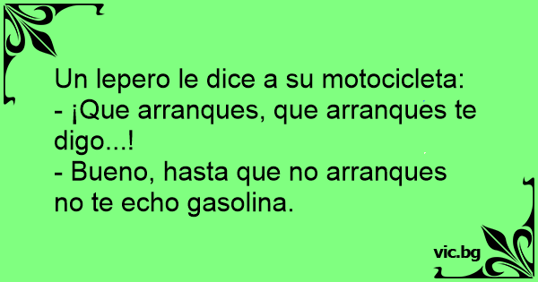 Un lepero le dice a su motocicleta:<br />- ¡Que arranques, que arranques te digo...!<br />- Bueno, hasta que no arranques no te echo gasolina.