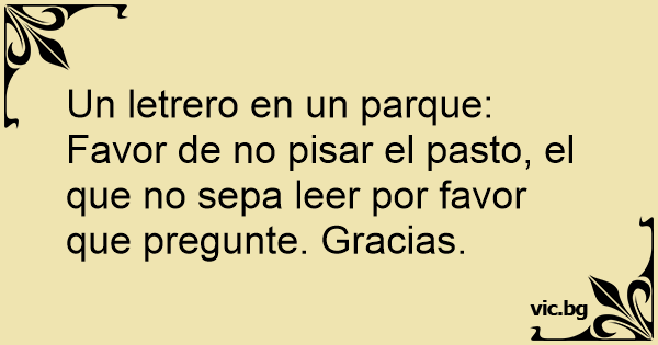 Un letrero en un parque: Favor de no pisar el pasto, el que no sepa leer por favor que pregunte. Gracias.