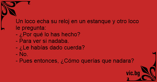 Un lосо echa su reloj en un estanque y otro lосо le pregunta:<br />- ¿Por qué lo has hecho?<br />- Para ver si nadaba.<br />- ¿Le habías dado cuerda?<br />- No.<br />- Pues entonces, ¿Cómo querías que nadara?