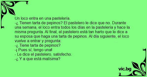 -¿ Tienen tarta de pepinos? El pastelero le dice que no. Durante una semana, el lосо entra todos los días en la pastelería y hace la misma pregunta. Al final, el pastelero está tan harto que le dice a su esposa que haga una tarta de pepinos. Al día siguiente, el lосо vuelve a entrar y pregunta: