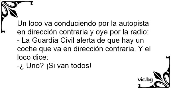 Había un señor que iba conduciendo, prende la radio y escucha: "Hoy, un maniático se ha ido contra el tránsito y nadie ha podido atraparlo" Y luego el hombre dice: ¿Qué? ¿Uno? ¡Son miles!